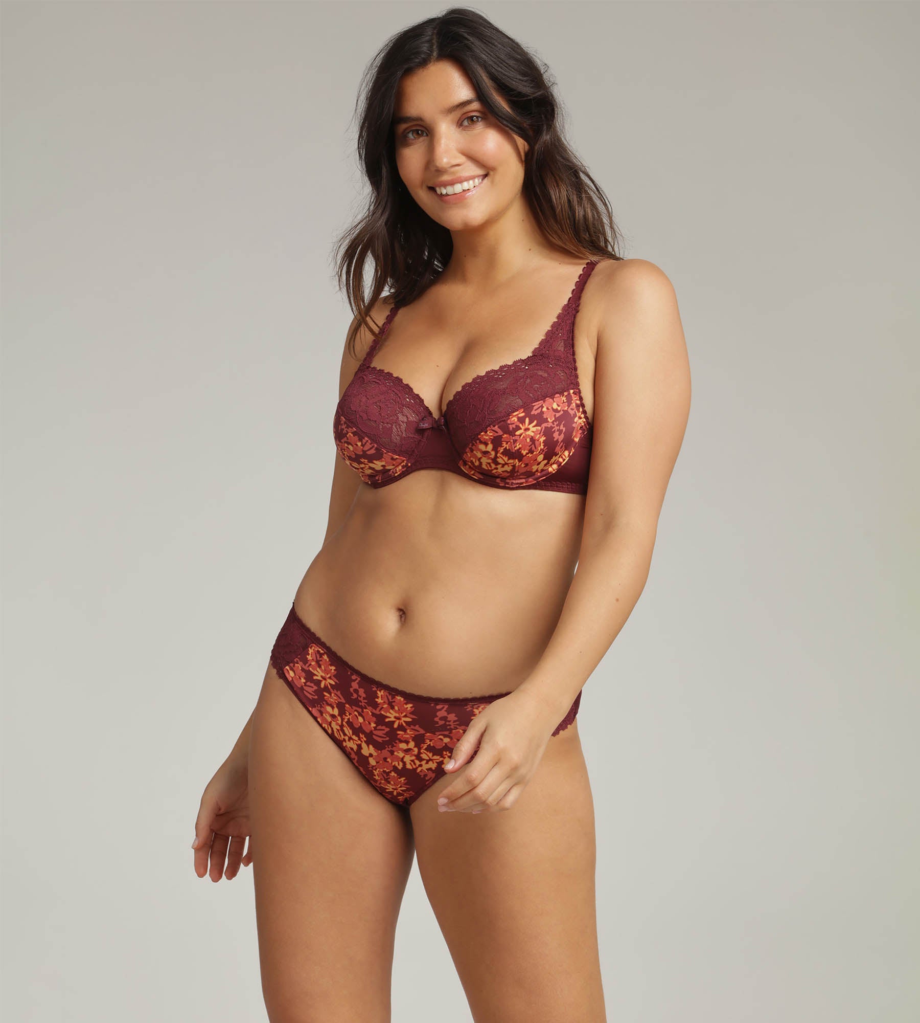 Team our Flower Elegance Micro knickers with the matching underwired bra in its colourful burgundy and orange/yellow print. A feminine and colorful set for all occasions!