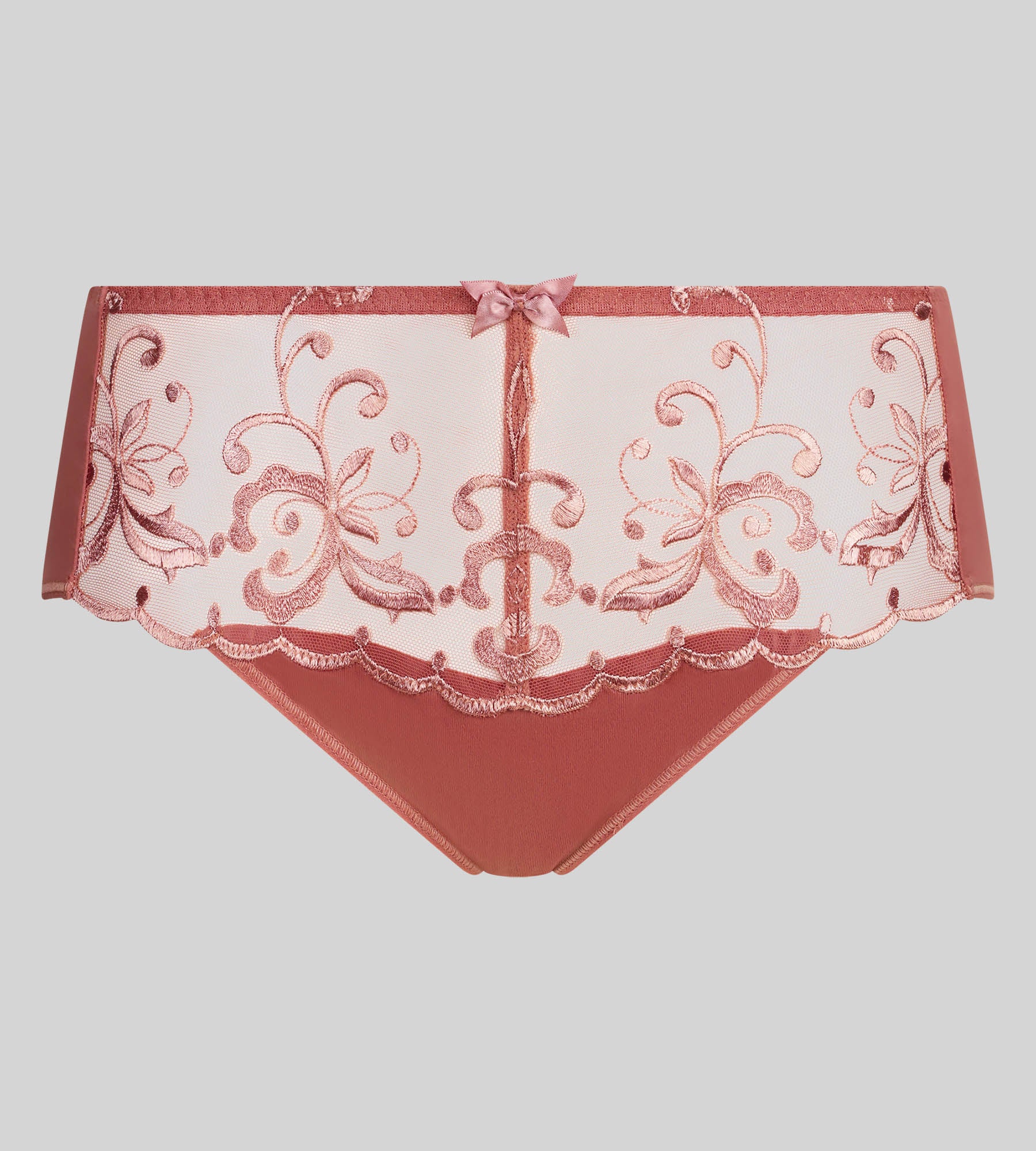 The Essential Elegance Embroidery cinnamon knickers combine comfort, elegance and femininity. Their soft microfibre fabric hugs your curves for optimal support, while the delicate embroidery and sheer detailing at the top add a subtle, refined charm. Their midi waist and full coverage ensure a sophisticated silhouette, and the small satin bow on the front completes this chic and feminine design.
