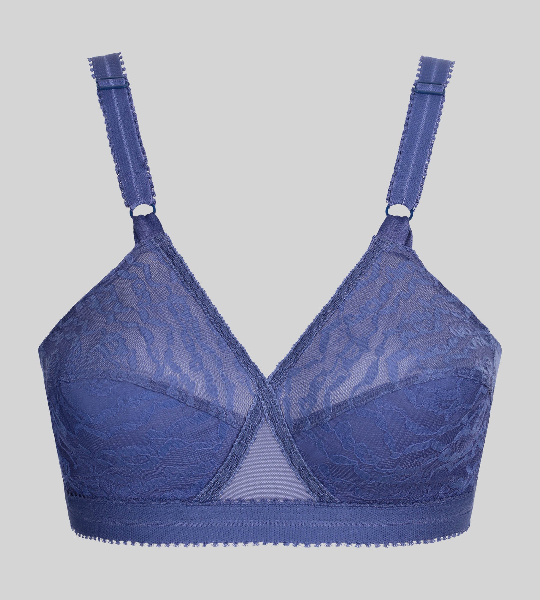 Combining support, femininity and lightness, the Cross Your Heart 165 embodies the perfect combination of Playtex® comfort and everyday elegance. Thanks to its iconic cross construction, this model delicately separates the bust with fine lace, offering perfect, natural support. The full cups, with a classic cross-cut, guarantee a flattering shape and enhance all busts. The inner and outer elastic bands are specifically designed to offer comfort and support for larger busts. The upper cup in transparent rigid mesh, accompanied by this sparkling blue colour, adds a subtle touch of femininity. The wide adjustable straps at the front allow for easy adjustment, and the wide U-shaped back, combined with two hook-and-eye fastenings, ensures a flawless fit throughout the day.
