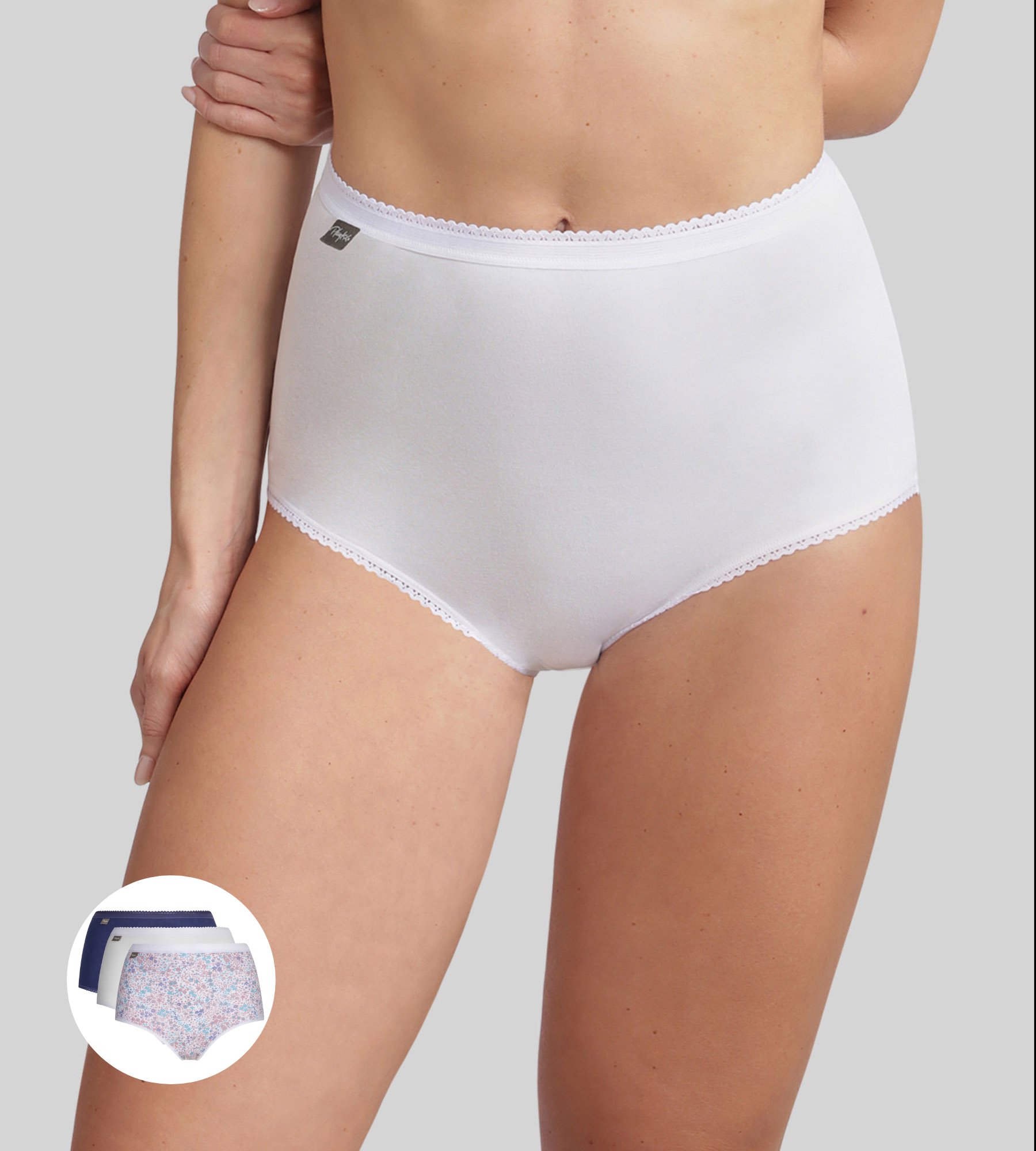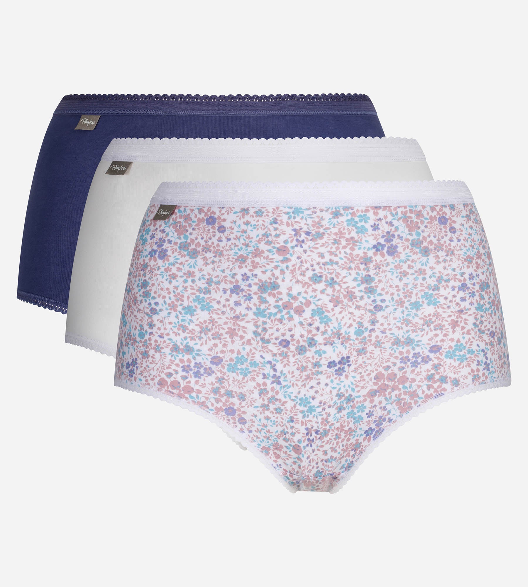 Pack of 3 full knickers in cobalt blue, white and pastel floral print Cotton Stretch