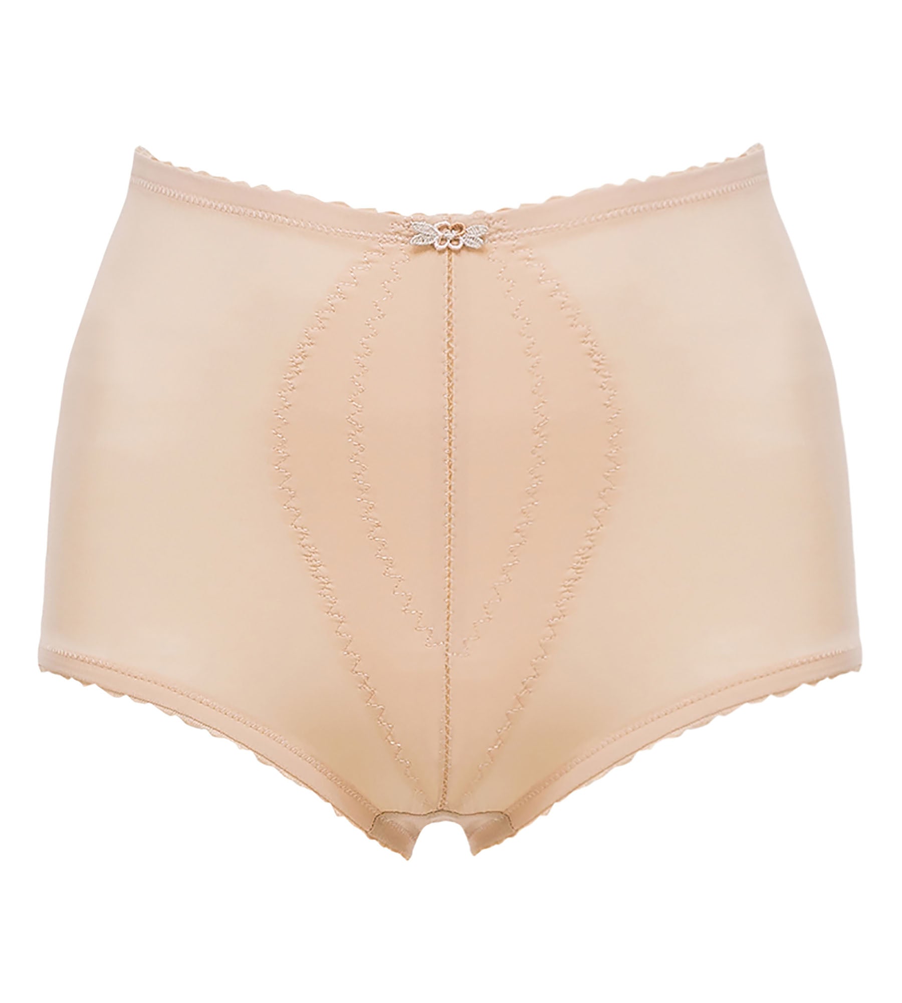 A shaping brief in skin tone from the I Can't Believe It's a Girdle collection? This comfortable and effective brief sculpts and refines your figure beautifully. Made using matte stretch microfibre, its high-waisted, ultra-comfortable design serves to shape and enhance your figure so that you can enjoy a flatter tummy and divinely feminine hips. Even the iridescent seams are designed to flatter your outline, while a back centre-line seam defines your hips. For extra feminine appeal, the waistband features a delicate flower detail and the leg lines and waist are finished with fine braiding.