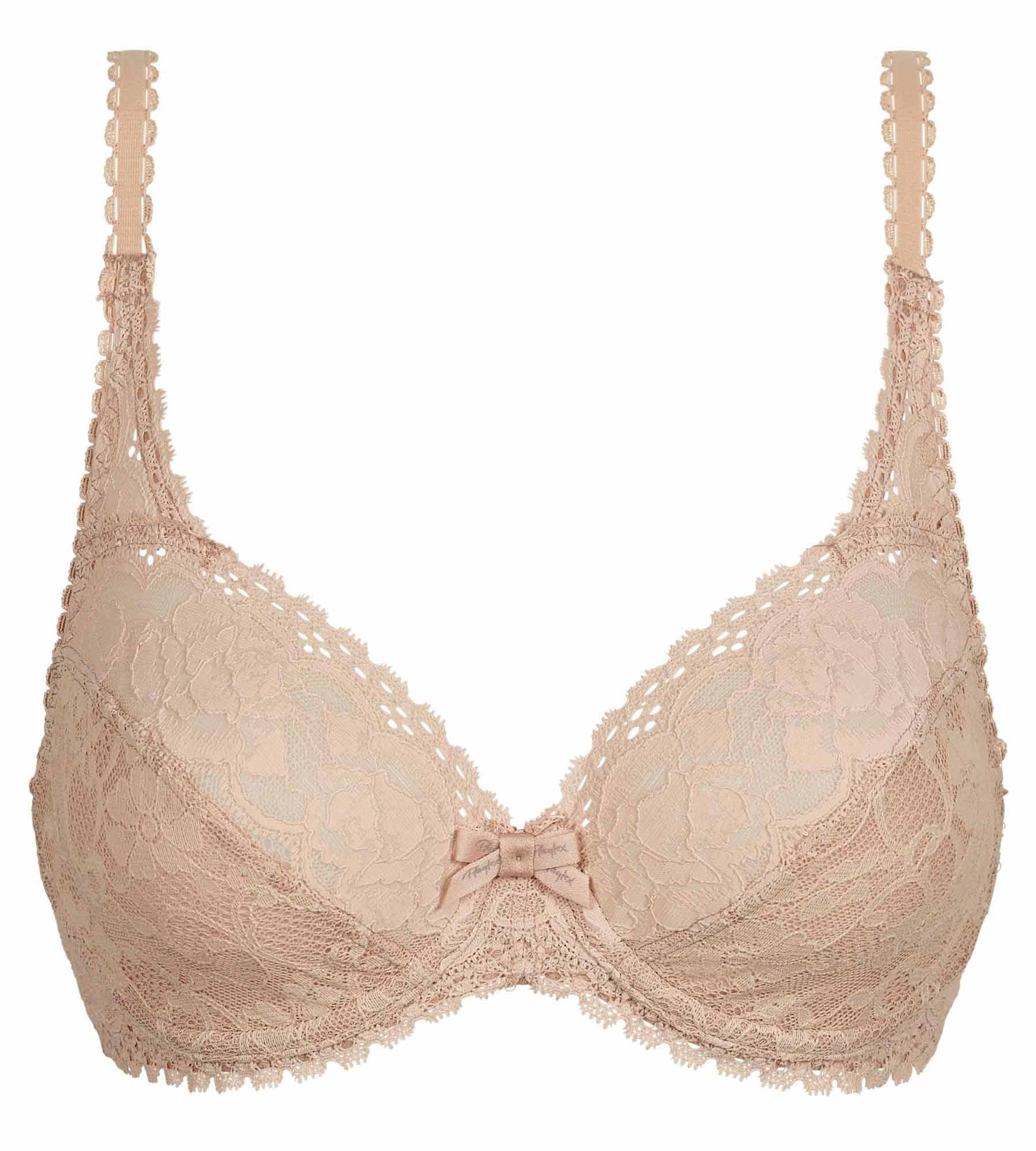 Complete your wardrobe with this underwired bra in beige Flower Elegance Recycled. This ultra-supportive underwired bra offers beautiful lift with complete comfort: U-back design, line bottom cups, soft and wide straps. It has no padding for a natural shape perfect for everyday wear. Recycled garland roses lace add an elegant touch to this full cup bra.
